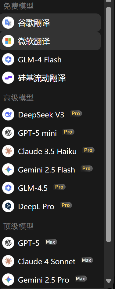 沉浸式翻译插件支持Deepseek、ChatGPT等多种主流的AI模型。