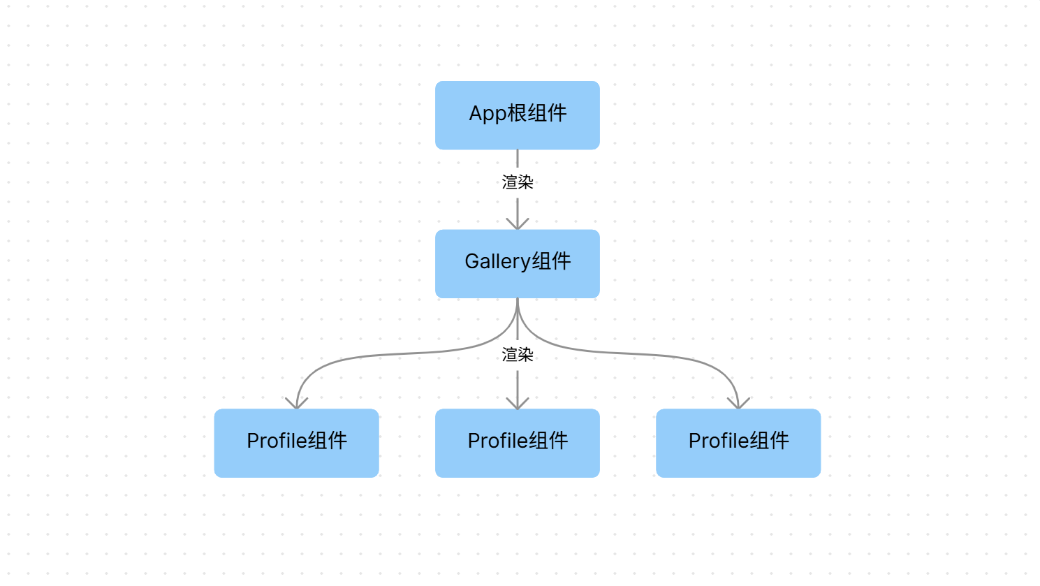 React基于组件构建页面时,首先从App组件开始渲染,然后不断渲染下层组件,最终渲染整个页面,最终会得到一棵组件树,其中App是整棵树的根组件。