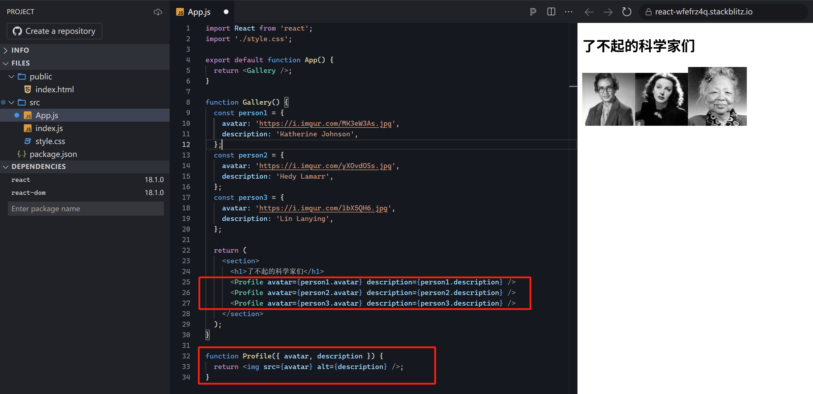 这需要组件接收一些参数,我再来看一个例子,给上面例子中的Profile组件添加参数: