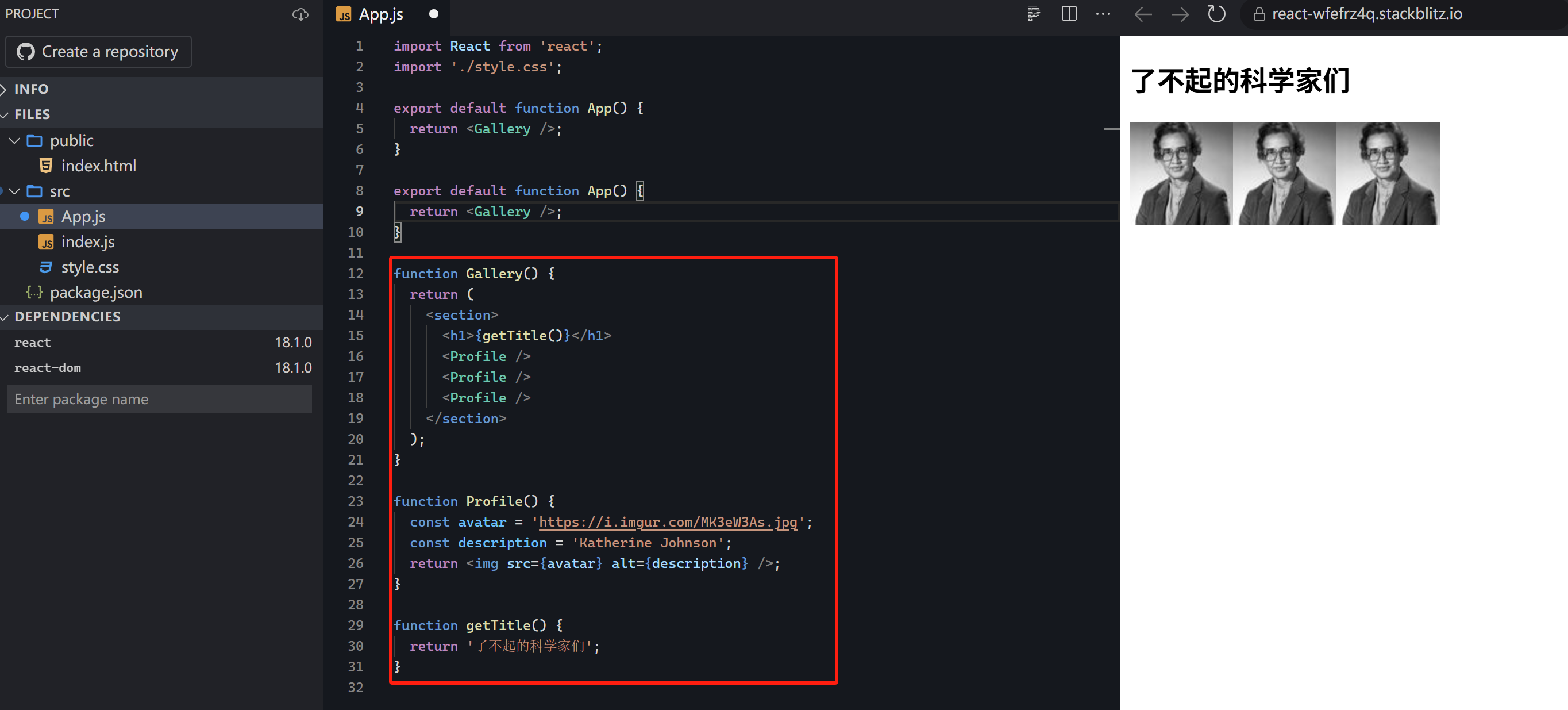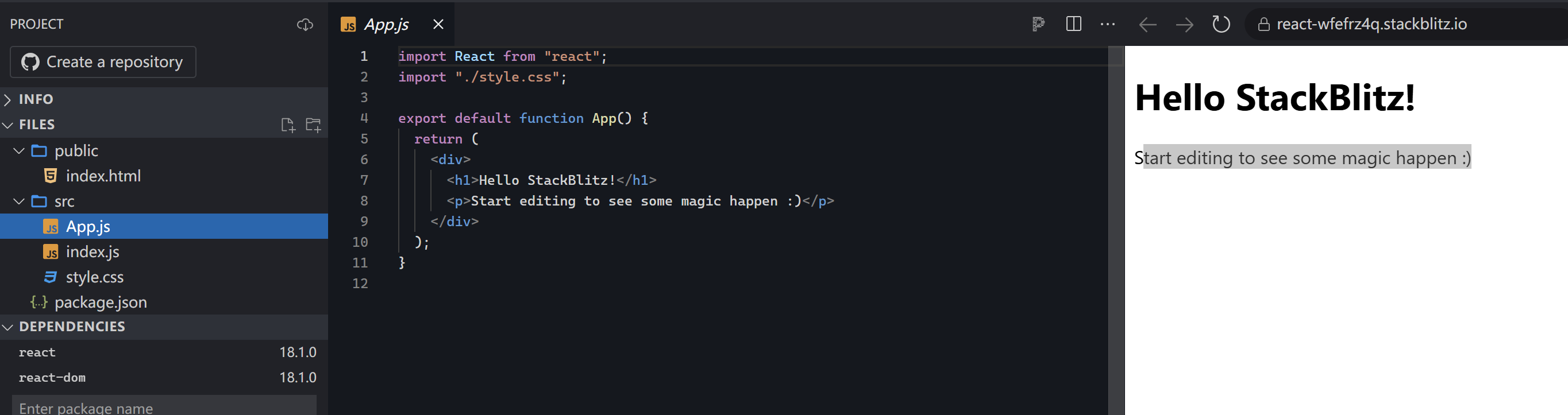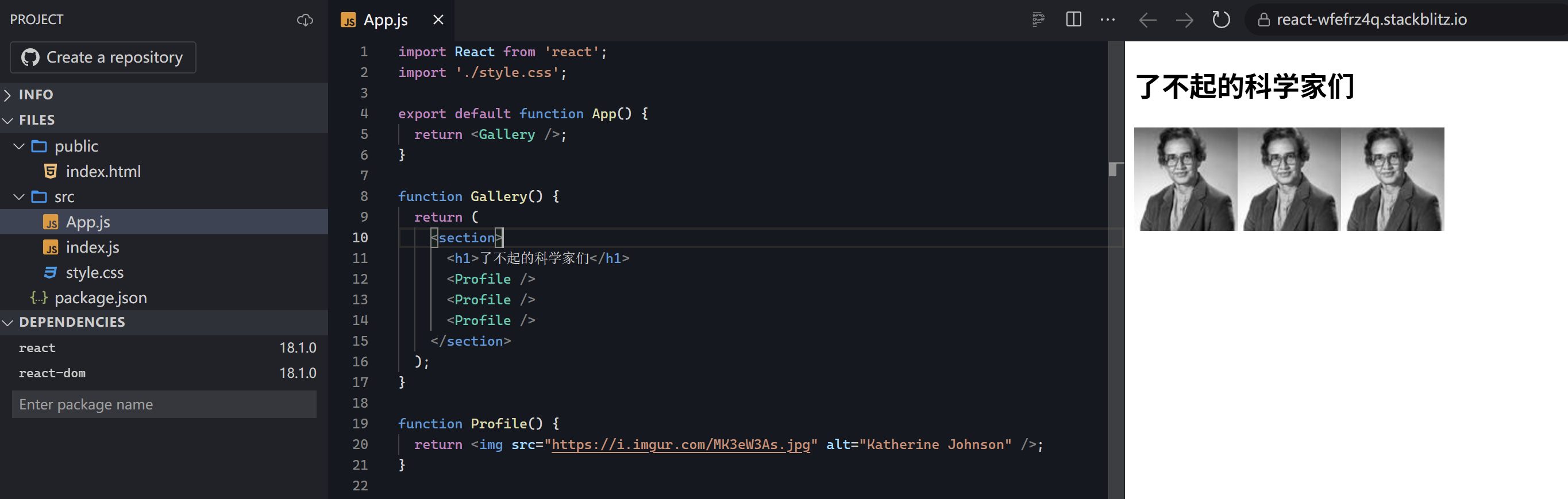 对于初次接触React的朋友,可以使用stackblitz的React模板快速学习:https://stackblitz.com/fork/react